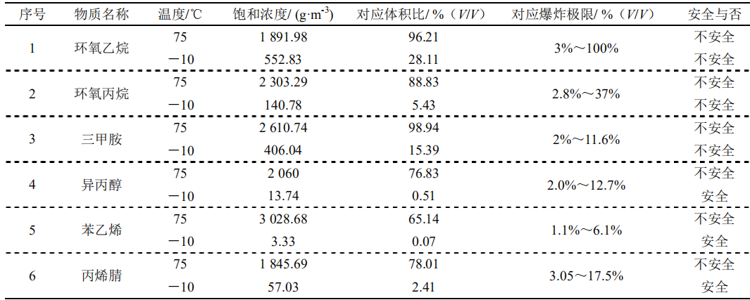 如表1所示,當真空泵出口尾氣溫度為75℃時,每種有機物質的飽和濃度理論上非常高。如果廢氣稀釋率不足,很容易引起安全事故。單套PL真空泵的環氧乙烷泄漏量約為120m3/h,三個真空泵的總流量為360 m3/h。事故發生時焚燒爐的實際處理風量也不超過5000m3/h,2.4%的平均濃度在相應的爆炸范圍內??梢姀U氣排放真空泵出口溫度過高,有機材料沸點低,導致有機廢氣濃度高。與此同時,相應的稀釋倍數不夠,再加上環氧丙烷和環丙烷,氧乙烷化學性質,最終達到有機成分的相應爆炸極限,造成爆炸事故。